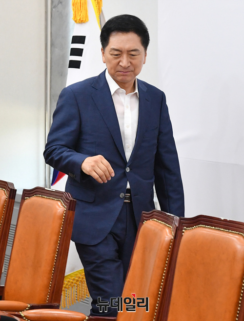 김기현 국민의힘 대표가 7일 오전 국회에서 열린 최고위원회의에 참석하기 위해 입장하고 있다.