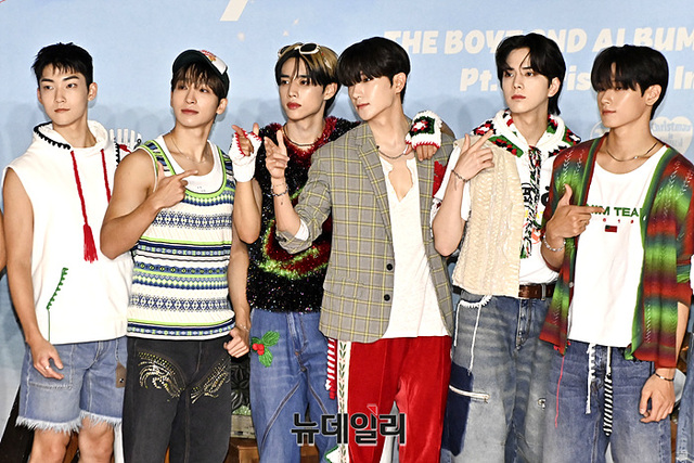 그룹 더보이즈 에릭(왼쪽부터) 케빈, 상연, 선우, 현재, 영훈, 주연, 주학년, 큐, 제이콥, 뉴가 7일 오후 서울 영등포구 CGV 영등포에서 열린 두 번째 정규앨범 '판타지 파트.1 8월의 크리스마스(PHANTASY Pt.1 Christmas In August)' 발매 기념 기자간담회에서 포토타임을 갖고 있다.이번 앨범은 타이틀곡 '립 글로스(LIP GLOSS)'를 포함해 '패션 프루트(Passion Fruit)' '라이트하우스(Lighthouse)' '줄리의 법칙' '파이어 아이즈(Fire Eyes)' '나만 아는 이야기(Fairy Tale)'까지 여섯 곡을 담았다. 음원은 6시 공개.