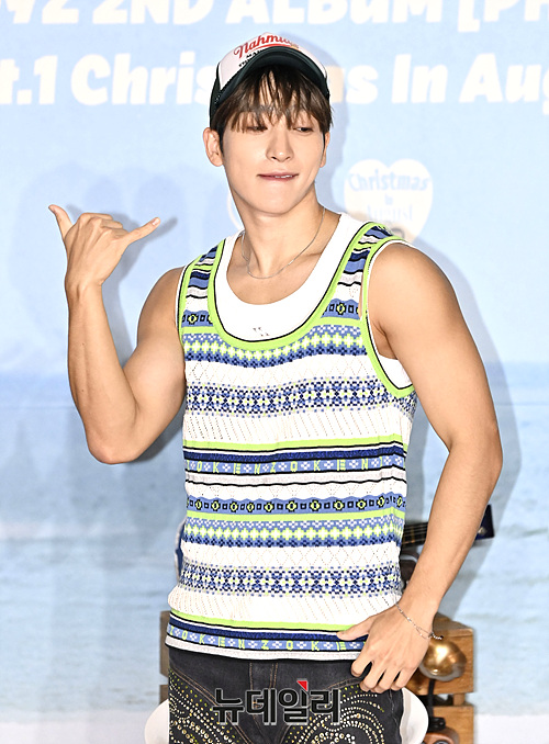 그룹 더보이즈(THE BOYZ) 뉴가 7일 오후 서울 영등포구 CGV 영등포에서 열린 두 번째 정규앨범 '판타지 파트.1 8월의 크리스마스(PHANTASY Pt.1 Christmas In August)' 발매 기념 기자간담회에서 포토타임을 갖고 있다.이번 앨범은 타이틀곡 '립 글로스(LIP GLOSS)'를 포함해 '패션 프루트(Passion Fruit)' '라이트하우스(Lighthouse)' '줄리의 법칙' '파이어 아이즈(Fire Eyes)' '나만 아는 이야기(Fairy Tale)'까지 여섯 곡을 담았다. 음원은 6시 공개.