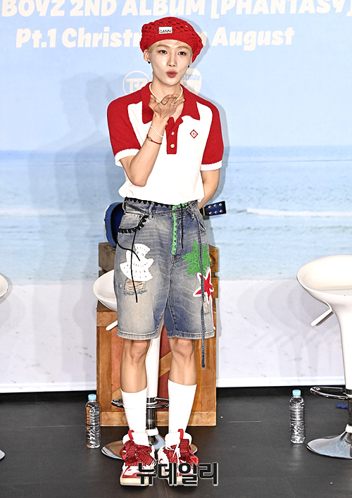 그룹 더보이즈(THE BOYZ) 뉴가 7일 오후 서울 영등포구 CGV 영등포에서 열린 두 번째 정규앨범 '판타지 파트.1 8월의 크리스마스(PHANTASY Pt.1 Christmas In August)' 발매 기념 기자간담회에서 포토타임을 갖고 있다.이번 앨범은 타이틀곡 '립 글로스(LIP GLOSS)'를 포함해 '패션 프루트(Passion Fruit)' '라이트하우스(Lighthouse)' '줄리의 법칙' '파이어 아이즈(Fire Eyes)' '나만 아는 이야기(Fairy Tale)'까지 여섯 곡을 담았다. 음원은 6시 공개.