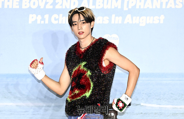 그룹 더보이즈(THE BOYZ) 선우가 7일 오후 서울 영등포구 CGV 영등포에서 열린 두 번째 정규앨범 '판타지 파트.1 8월의 크리스마스(PHANTASY Pt.1 Christmas In August)' 발매 기념 기자간담회에서 포토타임을 갖고 있다.이번 앨범은 타이틀곡 '립 글로스(LIP GLOSS)'를 포함해 '패션 프루트(Passion Fruit)' '라이트하우스(Lighthouse)' '줄리의 법칙' '파이어 아이즈(Fire Eyes)' '나만 아는 이야기(Fairy Tale)'까지 여섯 곡을 담았다. 음원은 6시 공개.