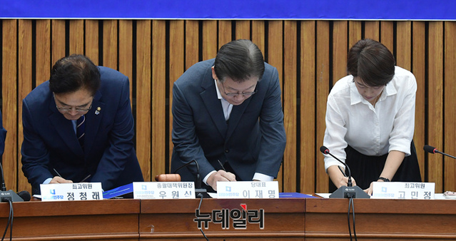 이재명 더불어민주당 대표와 최고위원들이 9일 오전 국회에서 열린 후쿠시마 원전오염수 해양투기 저지를 위한 UN인권이사회 진정서 서명식에서 서명을 하고 있다.