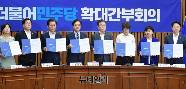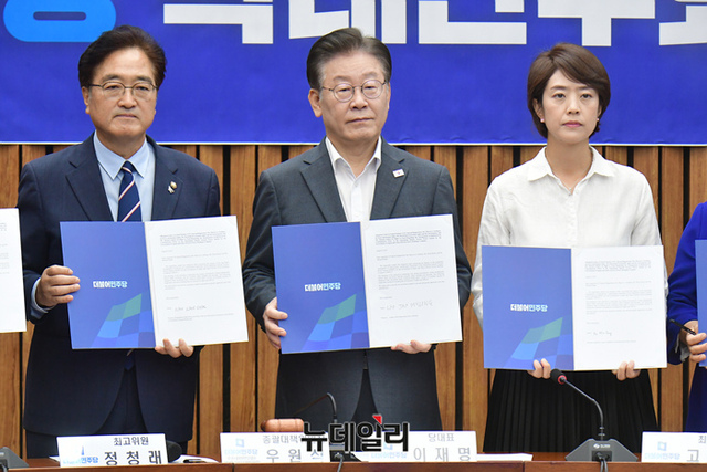 이재명 더불어민주당 대표와 최고위원들이 9일 오전 국회에서 열린 후쿠시마 원전오염수 해양투기 저지를 위한 UN인권이사회 진정서 서명식에서 진정서를 들어 보이고 있다.
