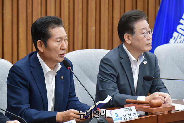 정청래 더불어민주당 최고위원이 9일 오전 국회에서 열린 확대간부회의에 참석해 모두발언을 하고 있다.