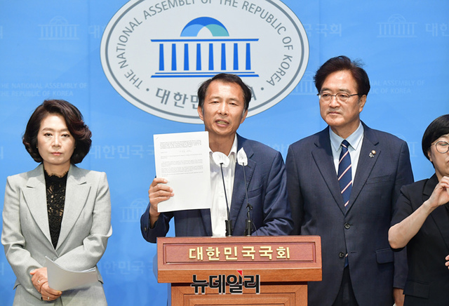 우원식 더불어민주당 의원 등 참석자들이 9일 오전 국회 소통관에서 후쿠시마 원전오염수 관련 유엔인권이사회 특별절차 진정 취지 설명 기자회견을 열고 있다.