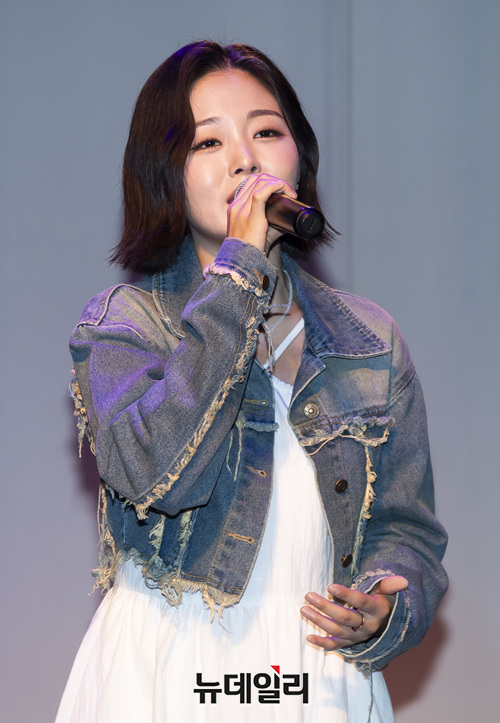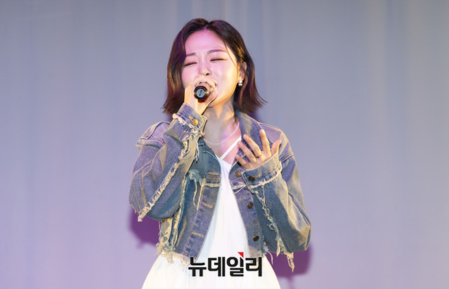 가수 박혜원(HYNN)이 10일 오후 서울 마포구 벨로주 홍대에서 열린 여름 소품집 '하계 : 夏季' 발매 기념 기자간담회에서 타이틀곡 '너에게로' 무대를 선보이고 있다.