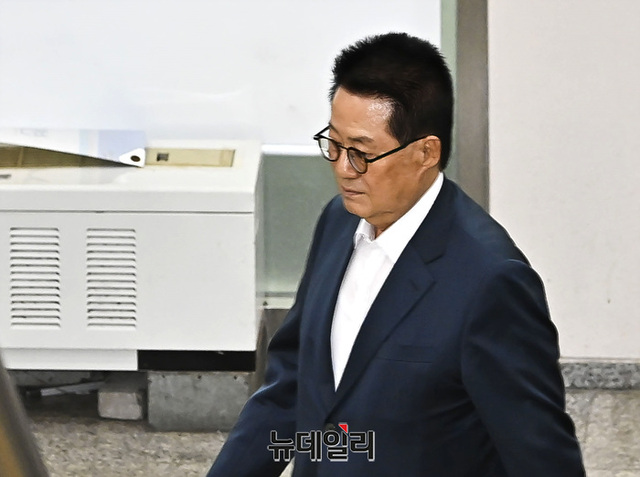 박지원 전 국정원장이 11일 오전 서울 서초구 중앙지방법원에서 열린 '서해 피격 사건' 공판 출석하고 있다.