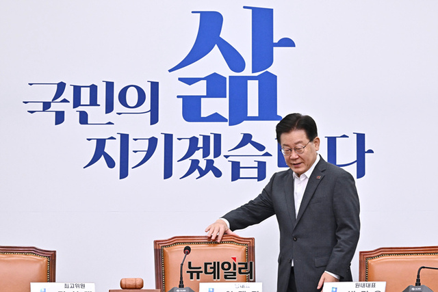 이재명 더불어민주당 대표가 14일 오전 국회에서 열린 최고위원회의에 참석하기 위해 입장하고 있다.