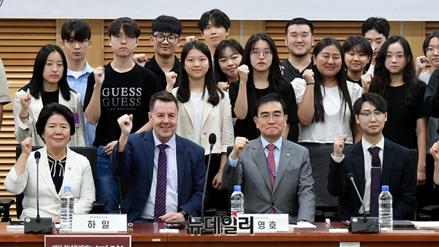 태영호 국민의힘 의원과 로버트 할리 광주외국인학교 이사장 등 참석자들이 14일 오전 국회 의원회관에서 열린 '해외 청년들에게는 술보다 흔한 마약!' 토론회에서 기념촬영을 하고 있다.
