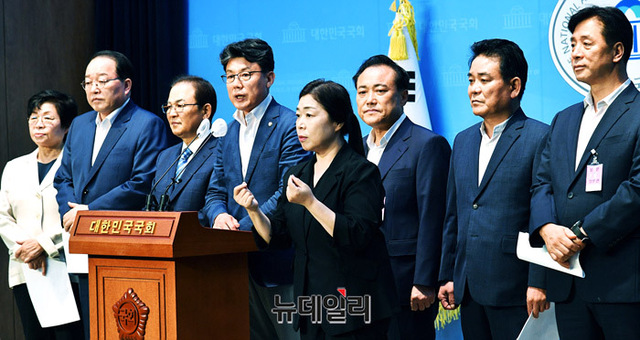진성준 더불어민주당 의원과 경만선, 김용연, 박상구, 이창섭, 장상섭, 한명희 강서구청장 보궐선거 출마예정자들이 14일 오후 국회 소통관에서 김태우 전 강서구청장 사면추진 관련 출마예정자 6인 합동 기자회견을 하고 있다.