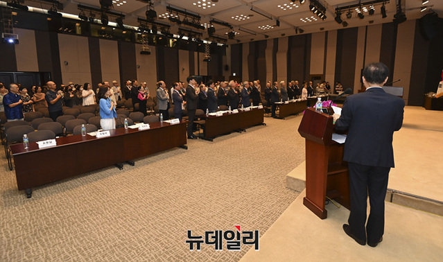 유동열 자유민주연구원 원장이 14일 오후 서울 중구 한국프레스센터에서 열린 건국 75주년 기념식에서 사회를 보고 있다.