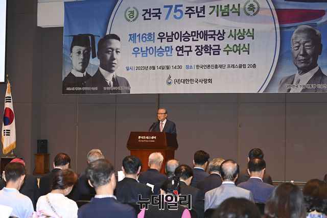 손병두 사단법인 대한민국사랑회 이사장이 14일 오후 서울 중구 한국프레스센터에서 열린 건국 75주년 기념식에서 개회사를 하고 있다.
