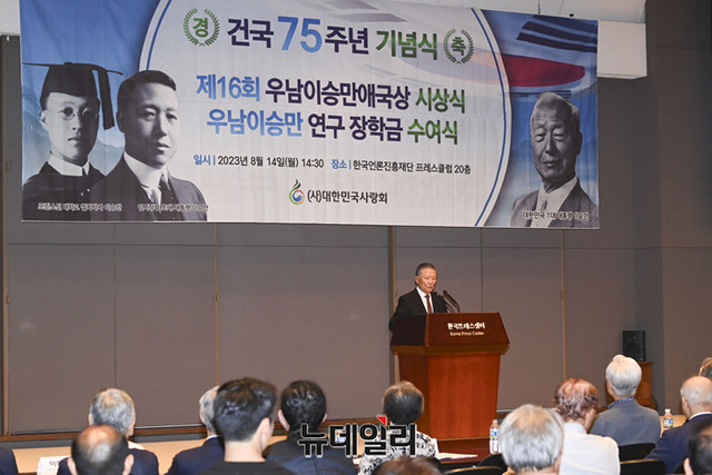 신철식 우남네트워크 회장이 14일 오후 서울 중구 한국프레스센터에서 열린 건국 75주년 기념식에서 축사를 하고 있다.