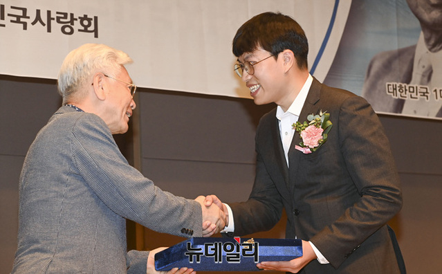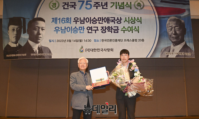 손영광 바른청년연합 대표가 14일 오후 서울 중구 한국프레스센터에서 열린 제16회 우남이승만애국상 시상식에서 청년상을 수상하고 있다.