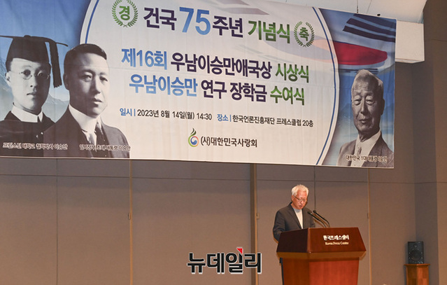 류석춘 박사가 14일 오후 서울 중구 한국프레스센터에서 열린 제16회 우남이승만애국상 시상식에서 축사하고 있다.