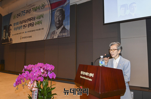김길자 대한민국사랑회 회장이 14일 오후 서울 중구 한국프레스센터에서 열린 건국 75주년 기념식에서 기념사를 하고 있다.