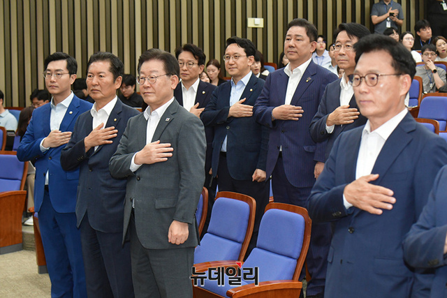 이재명 더불어민주당 대표 및 소속 의원들이 16일 국회에서 열린 의원총회에 참석해 국민의례를 하고 있다.