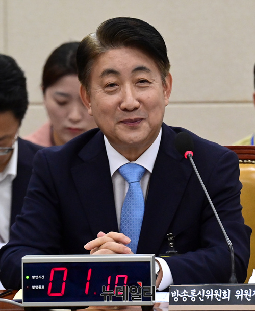 이동관 방송통신위원장 후보자가 18일 국회에서 열린 인사청문회에 참석해 웃음을 참고 있다.