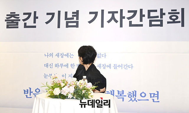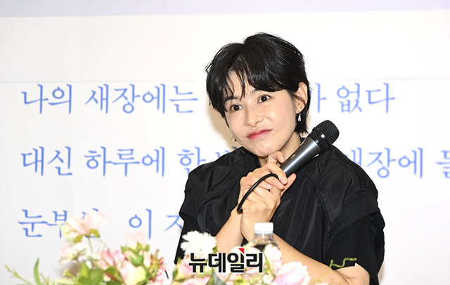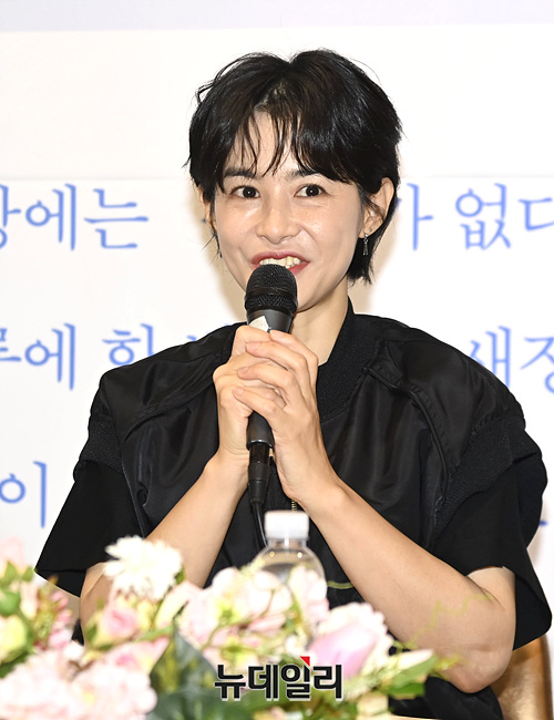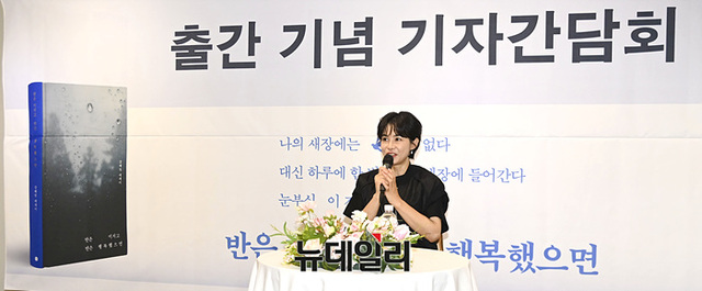 배우 강혜정이 21일 오전 서울 마포구 디어라이프에서 열린 에세이 '반은 미치고 반은 행복했으면' 출간 기념 기자간담회에서 인사말을 하고 있다.
