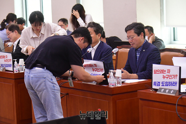 더불어민주당 법사위 소속 의원들이 21일 오전 국회에서 열린 법제사법위원회 전체회의에서 모니터에 '덮으려는 자 누구인가? 특검 도입하라!' 문구가 붙여 놓고 있다.