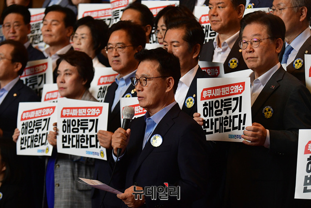 박광온 더불어민주당 원내대표가 22일 국회 로텐더홀 계단에서 열린 일본 후쿠시마 원전오염수 해양방류 규탄대회에서 발언을 하고 있다.