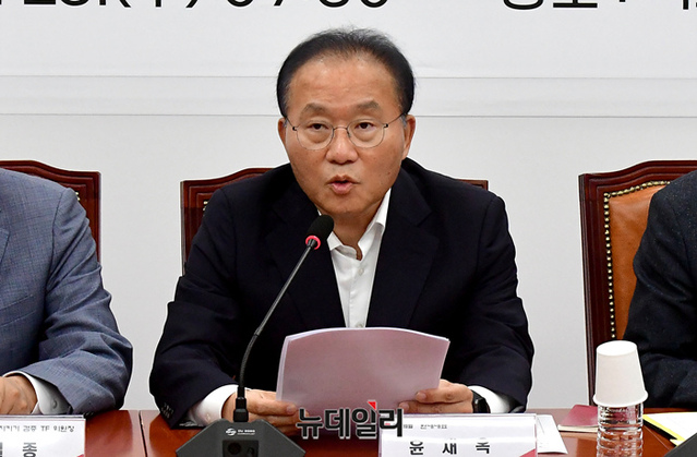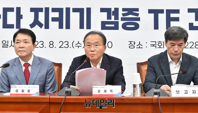 윤재옥 국민의힘 원내대표가 23일 오전 국회에서 열린 '우리바다 지키기 검증 TF 긴급회의'에서 발언을 하고 있다.