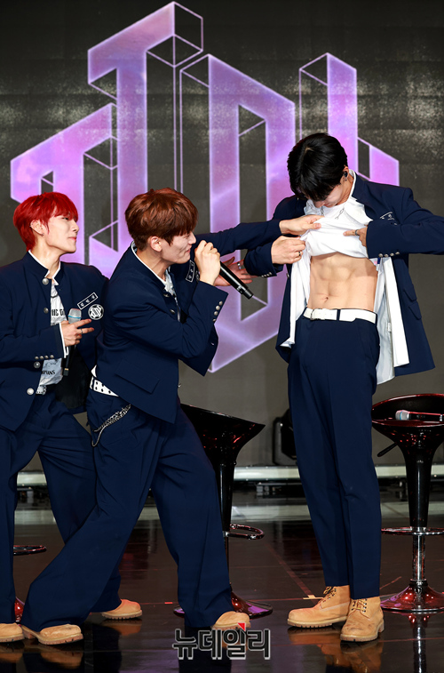 신인 아이돌그룹 티아이오티(TIOT) 홍건희가 23일 오전 서울 강남구 일지아트홀에서 열린 프리 데뷔앨범 쇼케이스에서 복근 공개를 하고 있다.