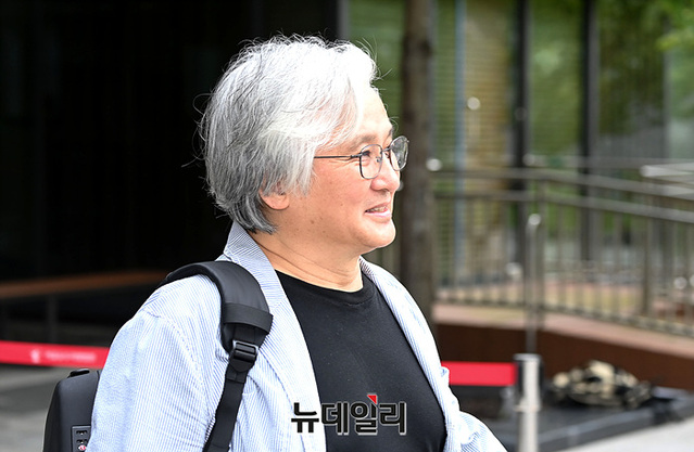 박원순 전 서울시장 성폭력 사건 피해자의 신원을 공개한 혐의로 재판에 넘겨진 김민웅 전 경희대 교수가 24일 오후 서울 송파구 동부지방법원에서 열린 항소심 선고 공판을 마치고 법원을 나서고 있다.