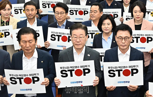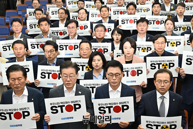 이재명 더불어민주당 대표, 박광온 원내대표를 및 소속 의원들이 24일 국회에서 열린 긴급 의원총회에서 '후쿠시마 핵오염수 해양투기 STOP'이 적힌 피켓을들고 구호를 외치고 있다.