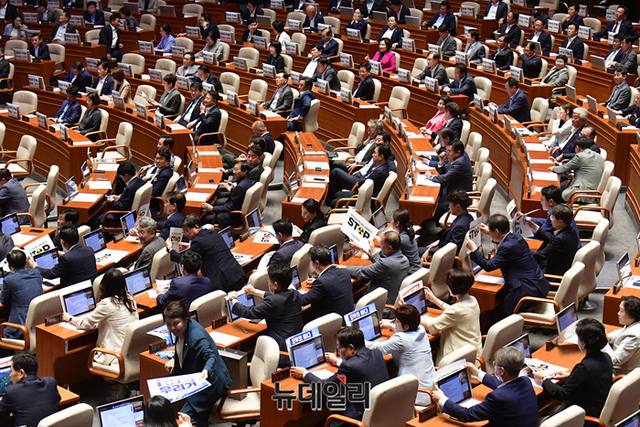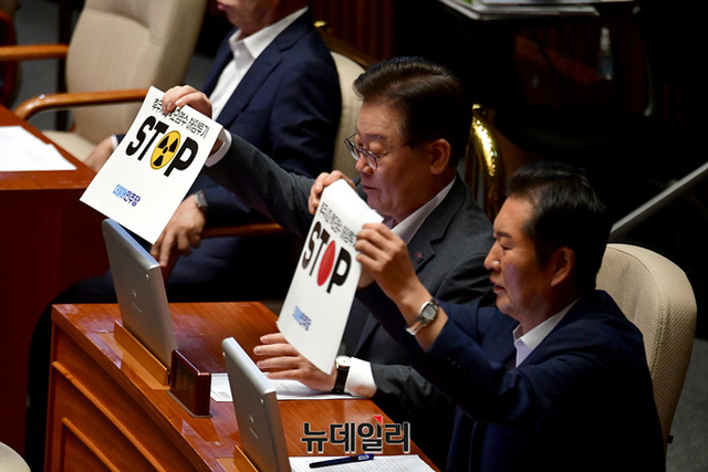 이재명 더불어민주당 대표 및 소속 의원들이 24일 국회에서 열린 본회의에서 '일본 후쿠시마 핵오염수 해양투기를 반대'하는 피켓을 붙이고 있다.