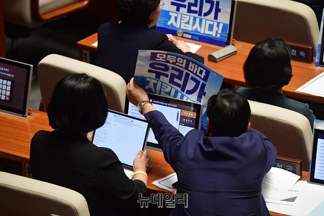 윤미향 무소속 의원이 24일 국회에서 열린 본회의에서 더불어민주당이 제공한 '일본 후쿠시마 핵오염수 해양투기를 반대'하는 피켓을 붙이고 있다.