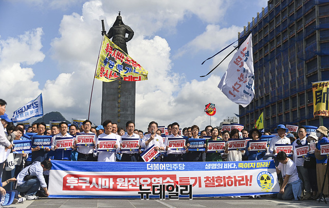 이날 현장에는 이 대표, 더불어민주당 지도부, 의원들 및 관계자들이 참석해 서울 광화문광장서 용산 대통령실 앞까지 후쿠시마 원전오염수 투기 철회를 촉구하며 행진했다.