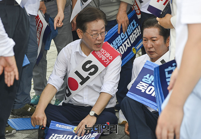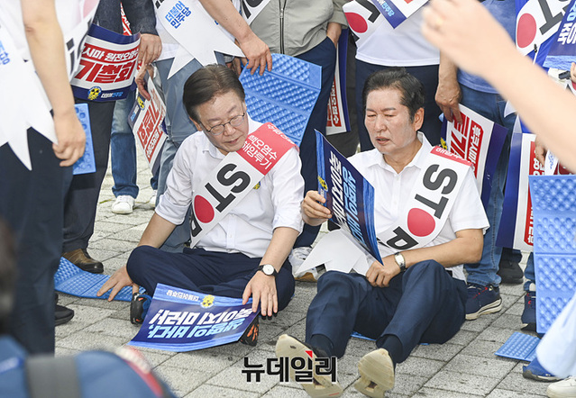 오염수 투기중단 촉구 행진을 마친 이재명 더불어민주당 대표와 정청래 의원이 25일 오전 서울 용산구 대통령실 앞 바닥에 앉아 있다.