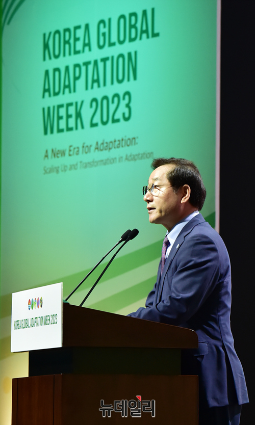 유정복 인천시장이 28일 오전 인천 연수구 송도컨벤시아에서 개막한 2023 유엔기후변화협약 적응주간 개회식에서 환영사를 하고 있다.2023 유엔기후변화협약 적응주간은 2019년 유엔기후변화협약 적응주간에 이어 2회 연속으로 인천 송도에새 개최된다. 전 세계적으로 기후위기가 심화돼 기후 위기 적응의 중요성이 커짐에 따라 세계 각국의 기후변화 적응대책과 이행 경험을 공유하기 위해 마련됐다.'적응의 새로운 시대 : 적응의 확대와 변혁'을 주제로 9월 1일까지 송도컨벤시아에서 열린다. (인천=정상윤 기자)