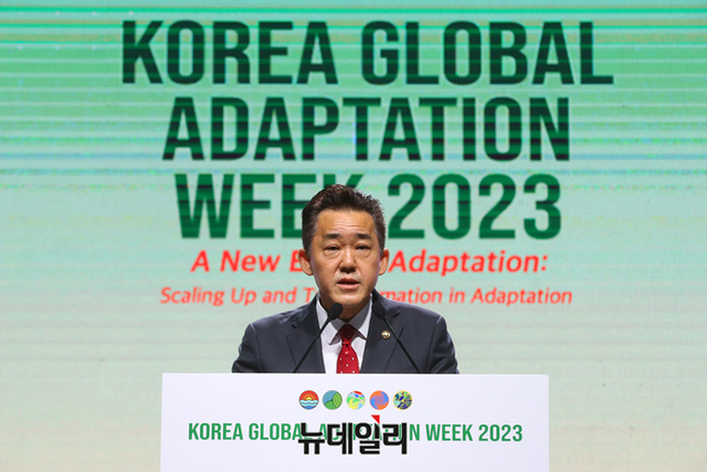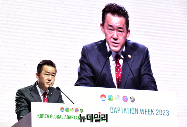 임상준 환경부 차관이 28일 오전 인천 연수구 송도컨벤시아에서 개막한 2023 유엔기후변화협약 적응주간 개회식에서 개회사를 하고 있다.2023 유엔기후변화협약 적응주간은 2019년 유엔기후변화협약 적응주간에 이어 2회 연속으로 인천 송도에새 개최된다. 전 세계적으로 기후위기가 심화돼 기후 위기 적응의 중요성이 커짐에 따라 세계 각국의 기후변화 적응대책과 이행 경험을 공유하기 위해 마련됐다.'적응의 새로운 시대 : 적응의 확대와 변혁'을 주제로 9월 1일까지 송도컨벤시아에서 열린다. (인천=정상윤 기자)