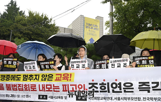 이날 기자회견은 국민희망교육연대, 서울시학부모연합, 전국학부모단체연합, 자유민주교육연합이 공동 주최해 △조희연 교육감 사퇴 △전교조 해체 △학생인권조례 폐지 등을 촉구했다.