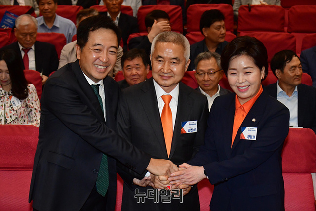 최진석 한국의희망 상임대표와 금태섭 전 의원, 양향자 한국의희망 공동대표가 28일 오후 국회 의원회관에서 열린 한국의희망 중앙당 창당대회에서 손을 맞잡고 있다.