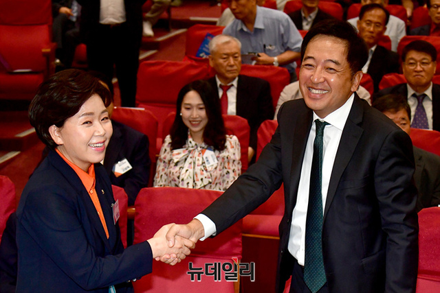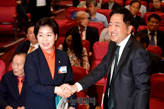 양향자 한국의희망 공동대표와 금태섭 전 의원이 28일 오후 국회 의원회관에서 열린 한국의희망 중앙당 창당대회에서 악수를 나누고 있다.