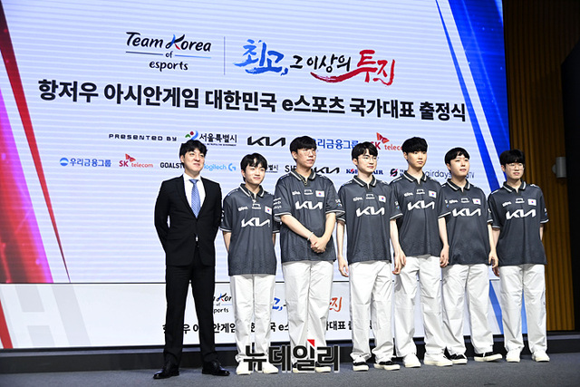 리그 오브 레전드 대표팀 선수들이 28일 오후 서울 중구 서울특별시청에서 열린 제19회 항저우 아시안게임 대한민국 e스포츠 국가대표 출정식에서 포토타임을 갖고 있다.코로나 19로 연기돼 올해 개최되는 제19회 항저우 아시안 게임은 9월 23일부터 10월 8일까지 진행된다. e스포츠는 9월 24일부터 10월 2일까지 각각 진행된다.대한민국 선수들은 △리그 오브 레전드 △배틀그라운드 모바일 △피파 온라인4 △스트리트 파이터 V까지 총 4종목에 참가한다.