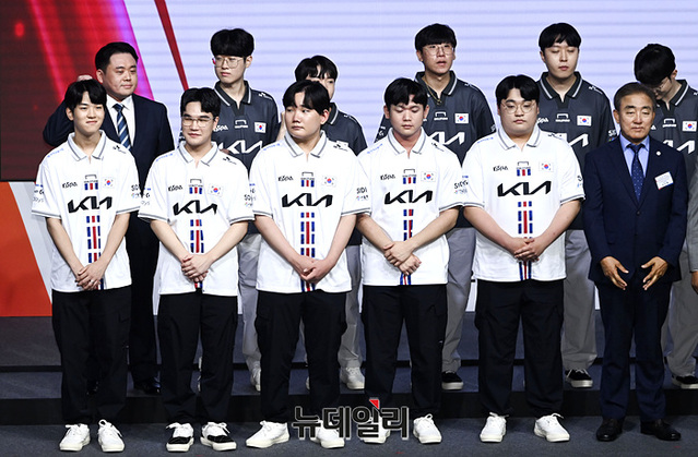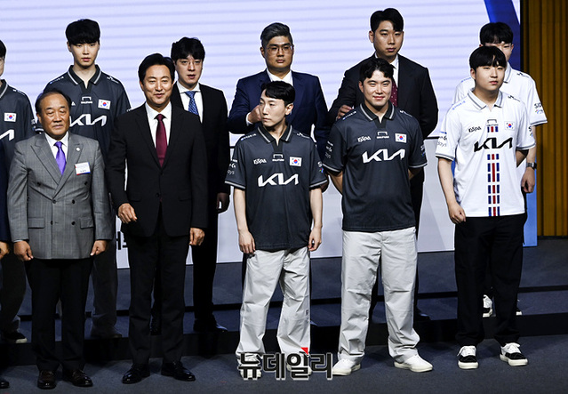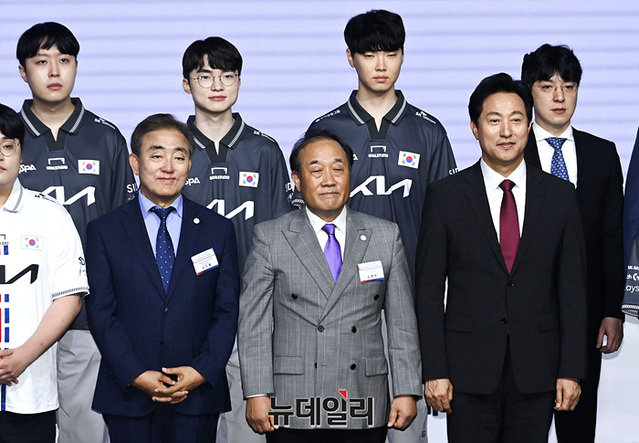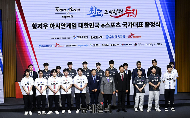 항저우 아시안게임 e스포츠 대표팀 선수들과 관계자들이 28일 오후 서울 중구 서울특별시청에서 열린 제19회 항저우 아시안게임 대한민국 e스포츠 국가대표 출정식에서 포토타임을 갖고 있다.코로나 19로 연기돼 올해 개최되는 제19회 항저우 아시안 게임은 9월 23일부터 10월 8일까지 진행된다. e스포츠는 9월 24일부터 10월 2일까지 각각 진행된다.대한민국 선수들은 △리그 오브 레전드 △배틀그라운드 모바일 △피파 온라인4 △스트리트 파이터 V까지 총 4종목에 참가한다.