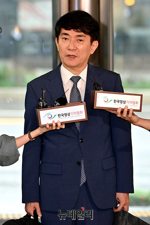이균용 신임 대법원장 후보자가 29일 오전 서울 서초구에 마련된 인사청문회 준비사무실로 출근하며 취재진의 질문에 답하고 있다.