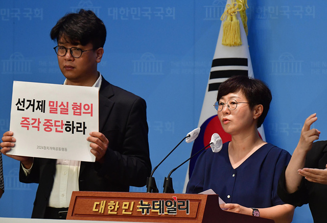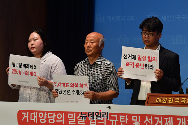 2024정치개혁공동행동 관계자들이 29일 오전 국회 소통관에서 '선거제 개편, 밀실협의 중단하고 국민공론 수용하라' 기자회견을 하고 있다.