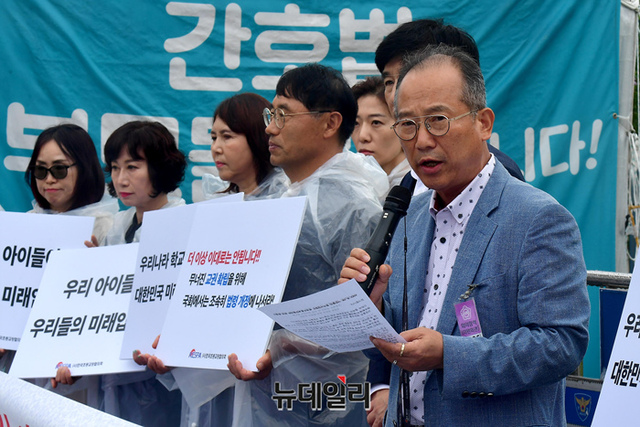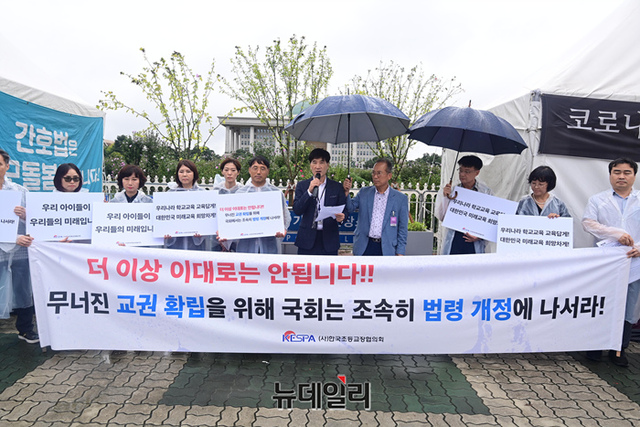 한국초등교장협의회 회원들이 29일 오후 국회 앞에서 열린 위기의 초등교육 살리기 서명 국회 전달 및 기자회견에서 교권 보호와 법령제 개정을 촉구하고 있다.