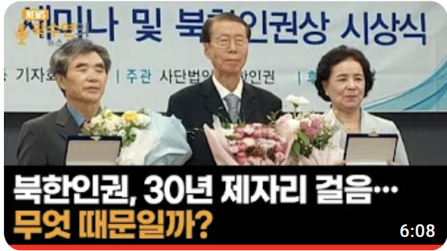 두 번째 수상자 이명옥 탈북구호연합회 대표는 20여년간 무수한 재중탈북민을 구출시킨 공로로 수상하게 됐습니다.이어 <북한인권과 시민사회의 역할> 세미나에서는 북한인권이 대중들에게 큰 관심과 호응을 얻지 못하고 있는 원인 분석과 반성의 시간을 가졌습니다.박선영 사단법인 <물망초> 이사장은 북한인권 문제가 거론된지 30여년이 지났지만, 대중에게 외면받고 있다며 이렇게 개탄했습니다."북한인권이 처음 거론된 것은 1994년 조창호 중위가 탈북해오면서다.