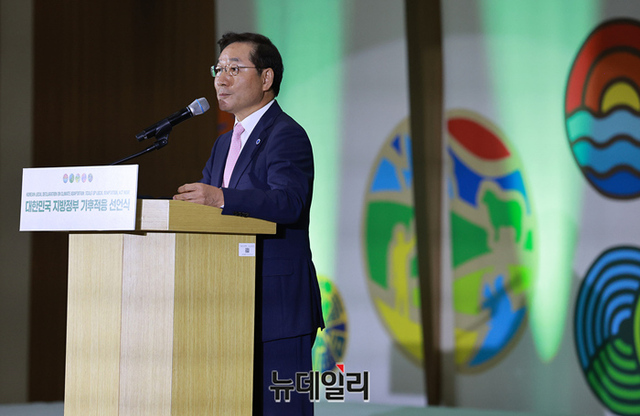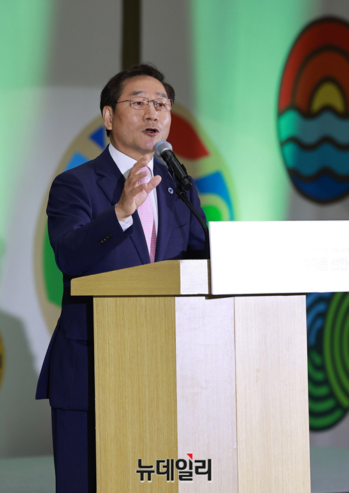 유정복 인천시장이 2023년 유엔기후변화협약 적응주간인 30일 인천 송도컨벤시아에서 열린 지방정부 기후적응 선언식에 참석해 환영사를 하고 있다.이날 선언식은 기후 적응 노력 의지 표명 및 대한민국 지방정부의 국제적 위상 확대를 위해 개최된 자리다. 임상준 환경부 차관, 김상협 탄녹위원장, 유정복 인천광역시장 등을 포함한 지자체 단체장들이 참석해 개회사, 축사, 선언식·우수적응 정책사례 발표(지자체) 등으로 진행됐다.유엔기후변화협약 적응주간은 '적응의 새로운 시대 : 적응의 확대와 변혁'을 주제로 9월 1일까지 송도컨벤시아에서 개최된다. (인천=정상윤 기자)