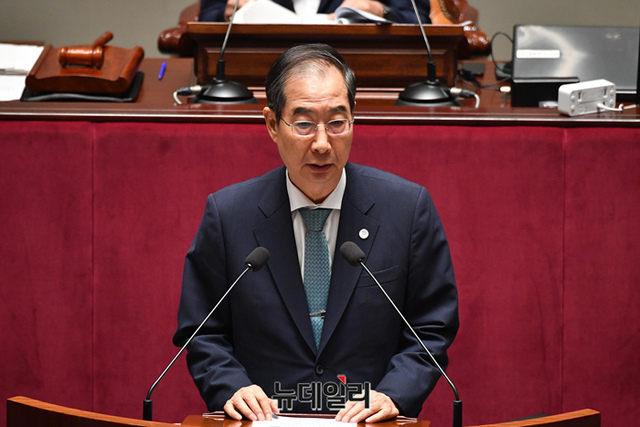 한덕수 국무총리가 30일 오전 국회에서 열린 예산결산특별위원회 전체회의에서 제안설명을 하고 있다.