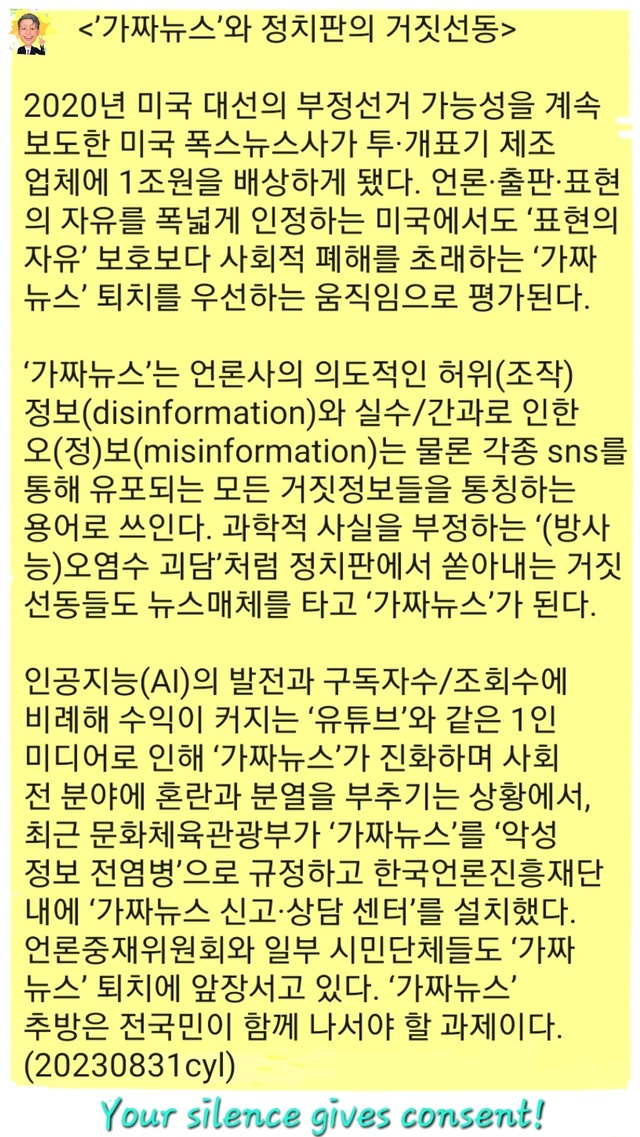 <'가짜뉴스'와 정치판의 '거짓선동'>언론·출판·표현의 자유를 폭넓게 인정하는 미국에서도 ‘표현의 자유’ 보호보다 사회적 폐해를 초래하는 ‘가짜뉴스’ 퇴치를 우선하는 움직임으로 평가된다.2020년 미국 대선의 부정선거 가능성을 계속 보도한 미국 <폭스뉴스>사가 투·개표기 제조업체에 1조원을 배상하게 됐다.