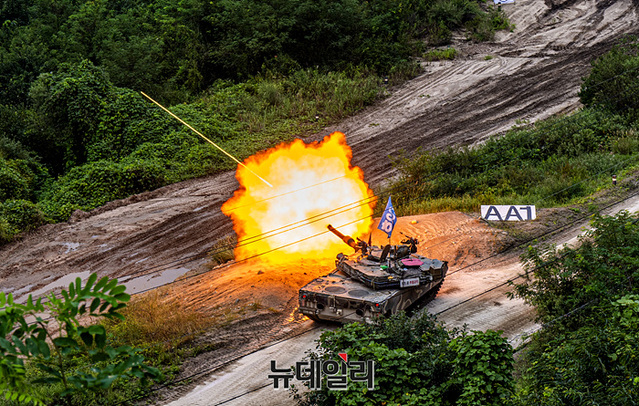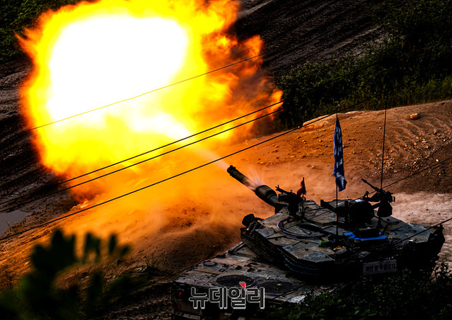 수도기계화보병사단이 30일 오전 강원 철원군 지포리 훈련장에서 을지프리덤실드(UFS)·타이거(TIGER) 일환으로 기동 및 화력지원 훈련을 진행하고 있다. K1A2 전차가 표적을 향해 불을 뿜고 있다.