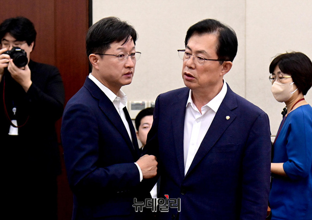 행정안전위원회 이만희 여당 간사와 강병원 야당 간사가 31일 오전 국회에서 김교흥 행안위원장과 대화하고 있다.