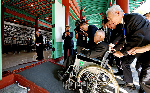 이승만 건국대통령 아들인 이인수 박사가 1일 오전 서울 강북구 4.19민주묘역에서 참배 및 사과하기 위해 유영봉안소로 이동하고 있다.